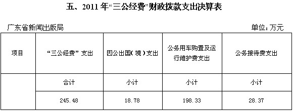 2011年省新闻出版局(包括局本部、局政务服务中心、新闻出版高级技工学校)“三公经费”财政拨款支出共245.48万元,具体情况如下: