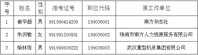 根据《中华人民共和国公务员法》和《广东省国家公务员录用实施办法》的有关规定,经过笔试、面试、体检、考核等程序,我局拟录用崔华超、朱闵敏、柴林恒等三名同志为我局公务员,现予公示。