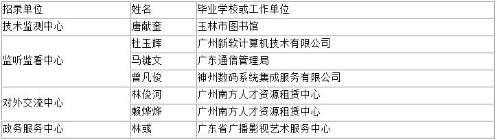 根据《广东省事业单位公开招聘人员办法》(粤府令第139号)和《广东省新闻出版广电局所属事业单位招聘工作人员公告》的有关规定,经过笔试、面试、体检、考察等程序,我局拟聘用唐献奎等7名同志为所属事业单位工作人员(名单附后),现予公示。如对拟聘用人选有异议或有其它问题,请向广东省新闻出版广电局人事处或省纪委派驻纪检组、监察室反映。