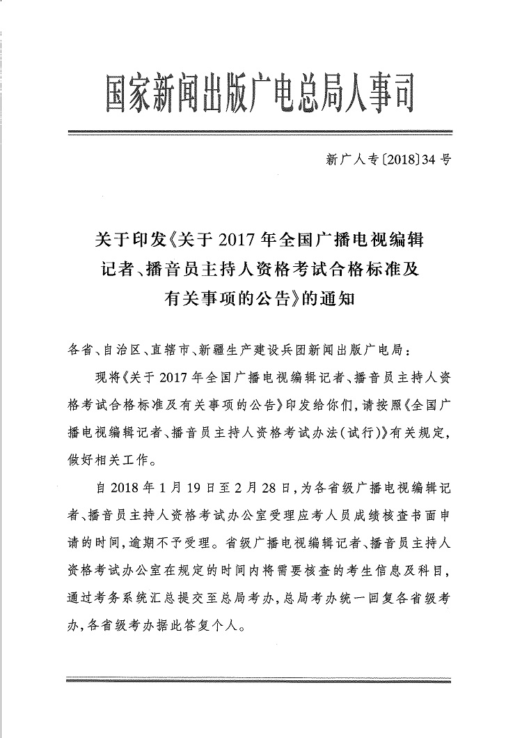 现将国家新闻出版广电总局人事司印发的《关于2017年全国广播电视编辑记者、播音员主持人资格考试合格标准及有关事项的公告》予以转发,请你们按照公告的要求办理。
