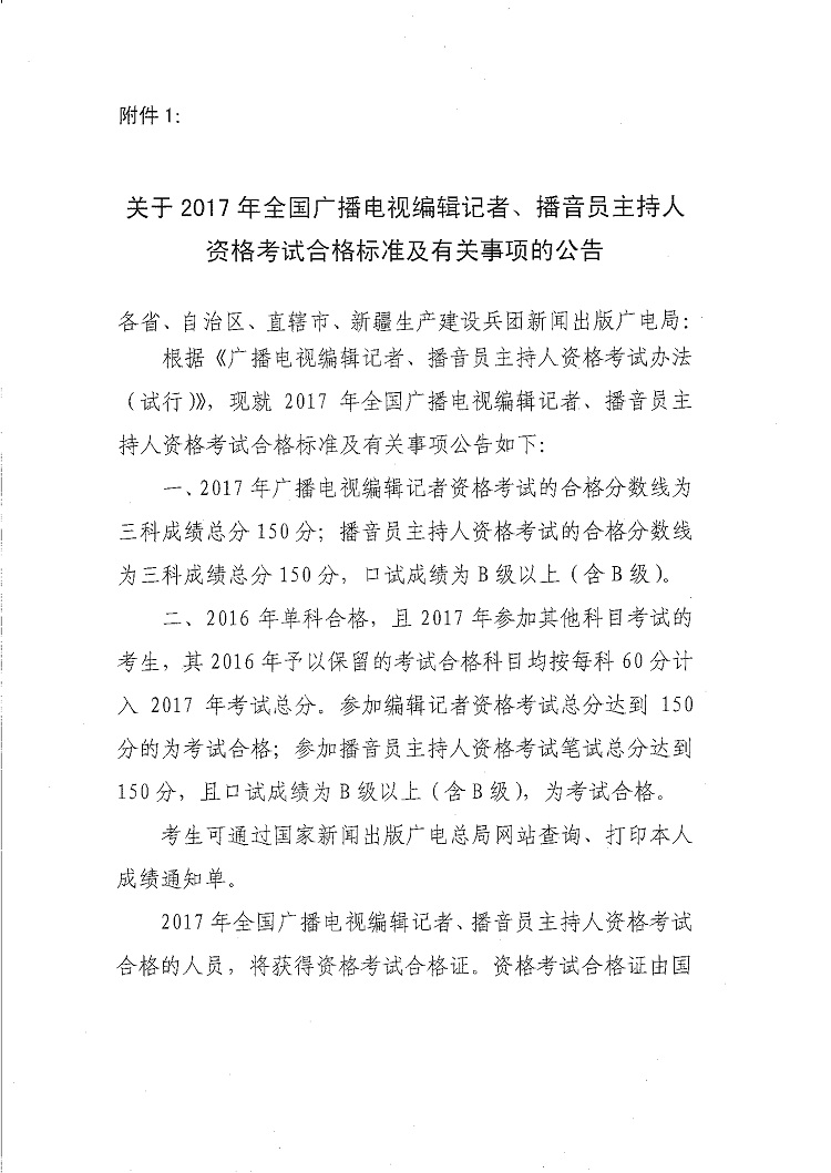 附件:1.关于2017年全国广播电视编辑记者、播音员主持人资格考试合格标准及有关事项的公告;